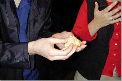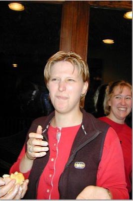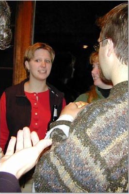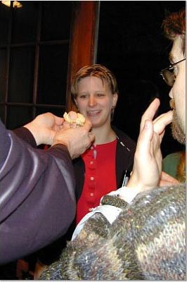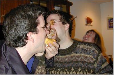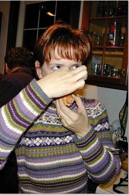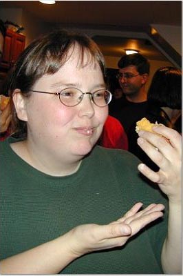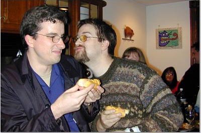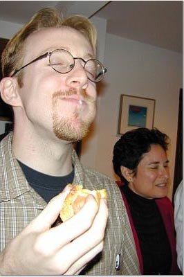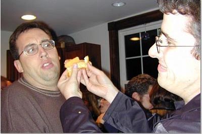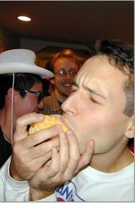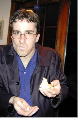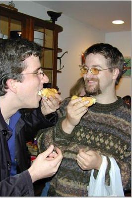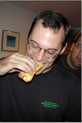 On October 20, 2001, while at a party at the home of my lovely friends Kevin and Peg, I took a can of Eazy Cheeze and began spraying people's initials onto Triscuits, then handing the cracker to the person in question. (An evil trick I got from Chris Reichert; the victim is pretty much compelled to eat the cracker.) Dan Sheldon, seeing me with the can, cried out "We should make Twinkie wiener sandwiches!" I laughed. I thought Dan was kidding. He was not. For you see, he returned about two minutes later, having confirmed with our hosts that there were hot dogs in their freezer. His excited momentum was infectious. We ran to CVS, grabbed all the Twinkies they had (six), and returned. |